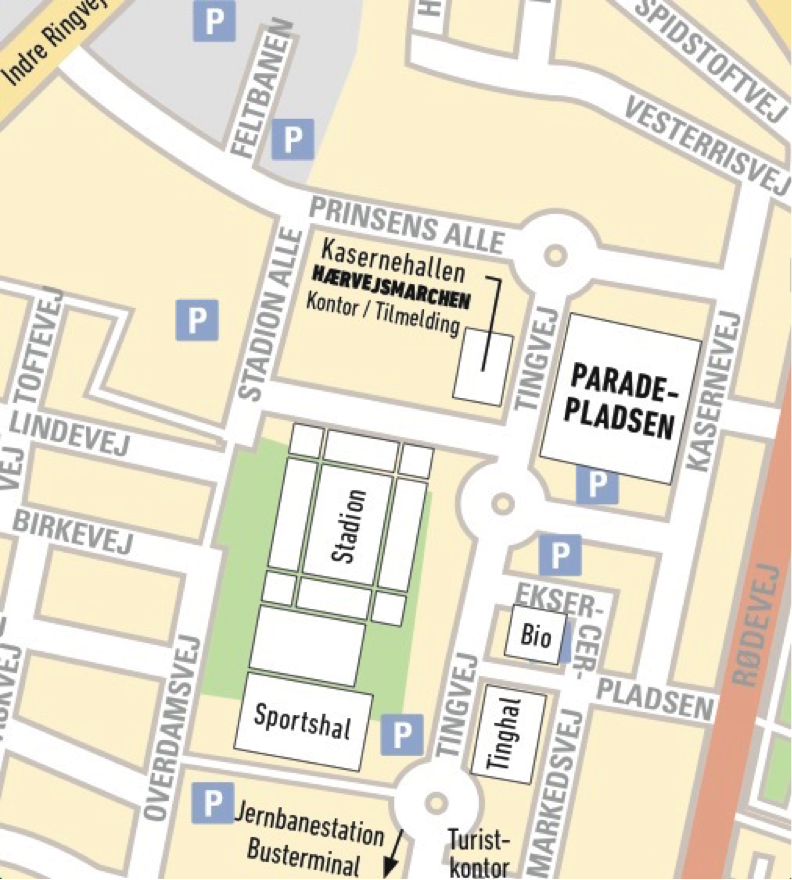 På kortet nedenfor vises p-pladserne i området omkring Paradepladsen. Det anbefales at benytte den store P-plads ved det nye Rådhus på Stadion Alle.