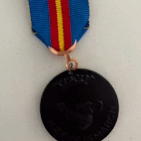 Ved målstregen ventede medaljen, og her fortalte min veninde, som har gået Hærvejsmarchen flere gange, at man kan få forskellige medaljer alt efter, hvor mange år man har deltaget. Inde i hallen kunne man se en hel udstilling af medaljer – og de var virkelig flotte. Jeg blev straks motiveret: Dem skal jeg da have flere af!