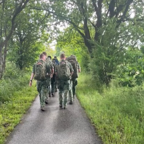 Jeg meldte mig til Hærvejsmarchen, fordi jeg gerne ville prøve at gå to dage i træk. Lørdag stod den på 30 km. Jeg startede tidligt – kl. 7 – og kom hurtigt til at gå bag nogle unge hollandske soldater. De satte et godt tempo, og jeg lod mig rive med. Ved det første depot omkring 13 km holdt de pause. Jeg havde egentlig ikke planlagt en pause dér, men en rullepølsemad kaldte på mig – og det var ikke til at sige nej til! Stemningen var fantastisk, med musik og god energi. Soldaterne blev siddende lidt længere, så jeg fortsatte alene.